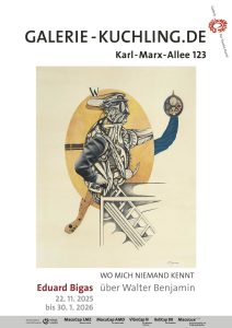 we are delighted to present the new exhibition “Wo mich niemand kennt” Eduard Bigas über Walter Benjamin starting next week, and warmly invite you to the Vernissage on Saturday, 22 November, from 6–10 pm.